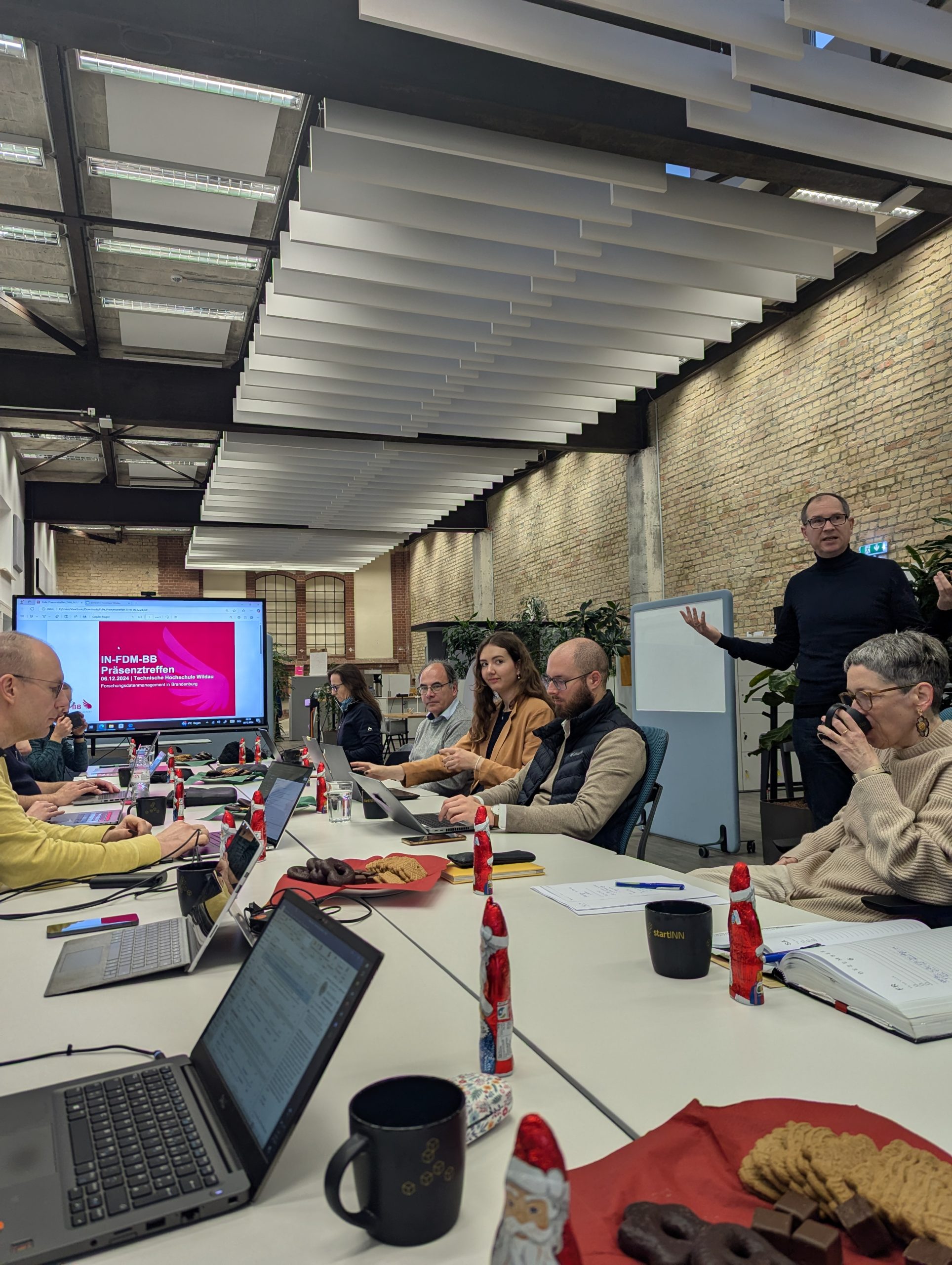 Trotz winterlicher Krankheitsausfälle und anhaltendem Regen fanden sich fast alle Projektbeteiligten zum letzten Projekttreffen des Jahres 2o24 in toller Atmosphäre in Wildau zusammen. Der ehemalige Industriestandort – vor über 100 Jahren eines der größten und modernsten Lokomotivwerke Europas – bot mit viel industriellem Flair und hohen Decken den passenden Rahmen, um die Weichen für den erfolgreichen Start in die letzten Projektmonate und ins Jahr 2025 zu stellen. Insbesondere die landespolitischen Entwicklungen und die Bemühungen um die Verstetigung von Personal und Dienste im Forschungsdatenmanagement standen im Zentrum der Diskussionen.